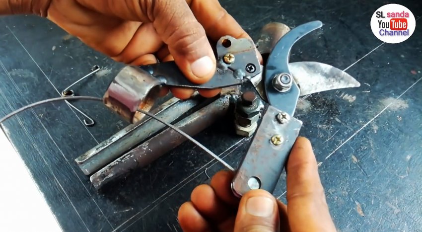 Нижняя часть с рычагом надевается на штангу аналогично. Выведенный край троса нужно завести в крепление, и зажать. В итоге нажимая рукой на рычаг, можно сводить ножницы. За счет же штатной пружины те разводятся обратно при отпускании рычага.