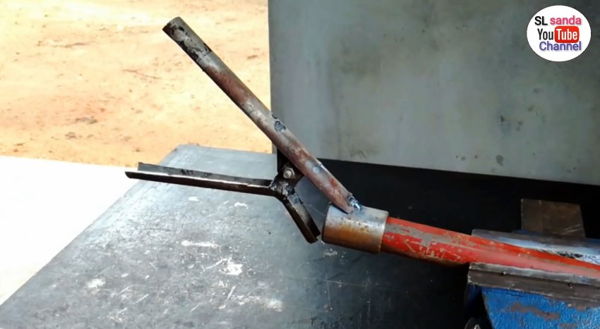 Закрепленный на проушинах флажок приваривается к прямой половине трубки. Получаем рычаг для управления секатором. Для его крепления к штанге из трубы 1/2 дюйма потребуется подобрать втулку. Последняя должна надеваться сверху. Рычаг приваривается ко втулке под углом прямой половиной.