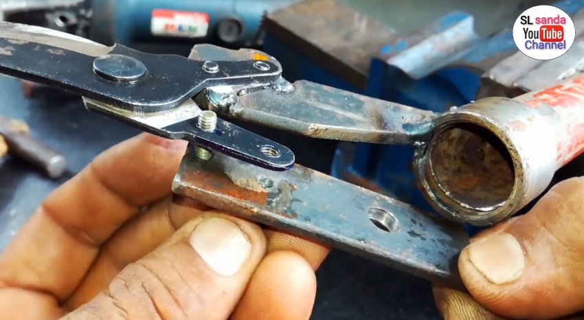 На второй край штанги надевается аналогичная втулка. К ней приваривается ручка из полосы, чтобы прикрутить нижний неподвижный нож секатора.