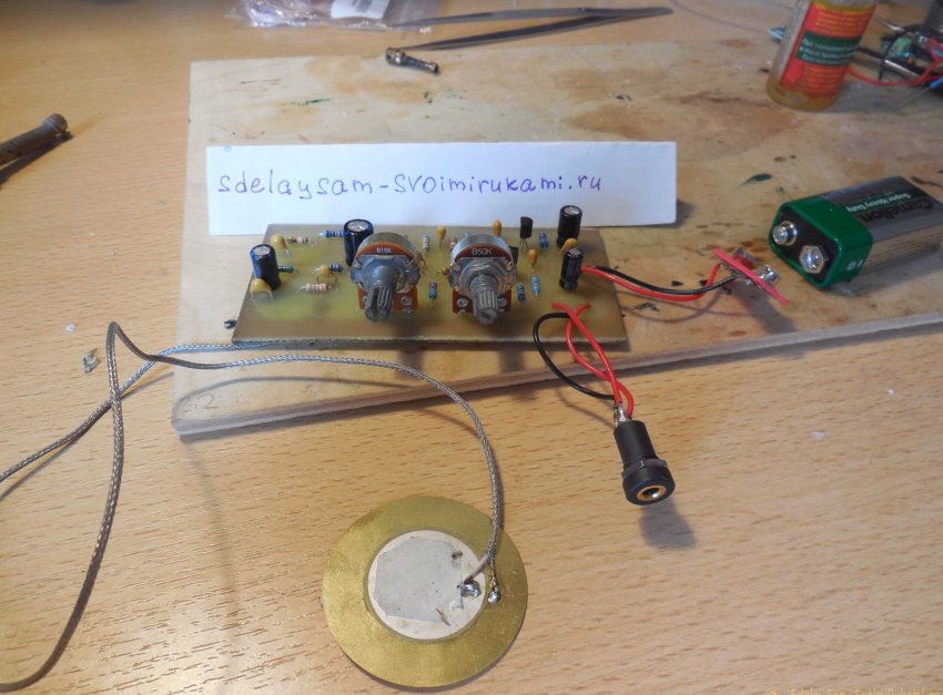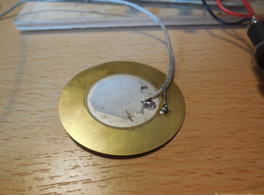 На схеме датчик обозначен как «Micro1» и находится в самой левой её части. В качестве датчика будет использоваться пьезопластина – самая обычная пищалка, какие стоят во многих игрушках, мультиметрах и другой электронике. Её латунная подложка припаивается к земле схемы, а сам пьезокристалл – ко входу, при пайке пьезопластин следует быть осторожным, так как они теряют свои свойства от нагрева. Разные пьезопластины могут давать разный результат по чувствительности, хороший результаты показали крупные экземпляры (диаметр 4 см), также, по некоторым сведениям, отличную чувствительность дают отечественные ЗП-3 и другие из этой серии. Пьезопластину можно использовать в голом виде, приклеивая двусторонним скотчем к объекту, который нужно прослушать, либо сделать из неё полноценный датчик, смонтировав в корпусе и сделав подпружиненную иглу-звукосниматель – это даст хороший прирост чувствительности. Пьезопластина припаивается ко входу схемы гибким экранированным проводом, я использую для этого МГТФЭ.