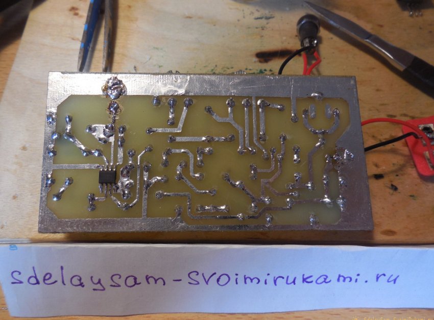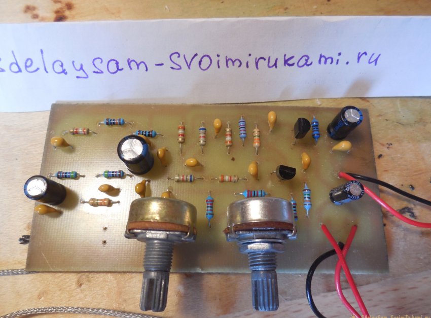 Выполнялась печатная плата обычным ЛУТ-методом, который неоднократно описывался в интернете. Переменные резисторы впаиваются прямо на плату, рядом с ними предусмотрены гнёзда 3,5 мм для подключения штекера наушников (выход) и пьезопластины (вход), питание подаётся по двум проводкам. Собранная плата без корпуса будет неплохо ловить наводки, особенно при приближении к сетевым проводам. Чтобы этого избежать, плату можно поместить в металлический корпус, который соединяется с землёй схемы, наружу вывести только экранированный провод до датчика. Собранный стетоскоп обладает действительно неплохими характеристиками, с его помощью можно отчётливо услышать разговор людей, находящихся через нетолстую стену, даже при использовании примитивного датчика.