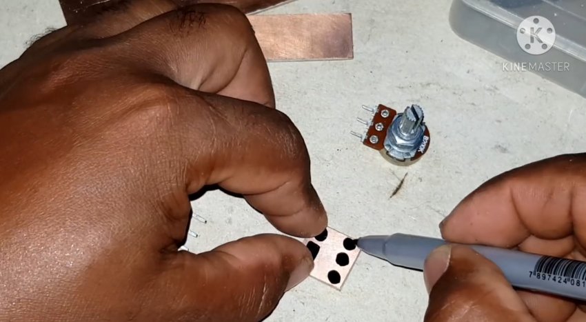 Топология платы показана на рисунке Диаметр контактных площадок составляет примерно 2,3 – 3 мм, расстояние между центрами площадок и диаметр отверстий должны соответствовать габаритам выводов симистора и потенциометра.