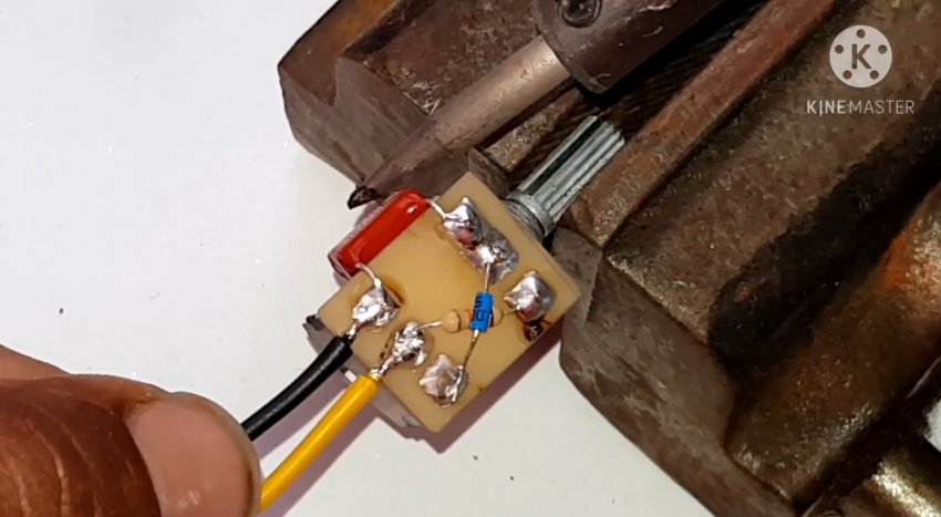 Функции несущей основы схемы выполняет печатная пата, на которую, начиная с симистора и потенциометра, напаиваются все пять компонентов, а затем опять же пайкой подключаются соединительные провода.