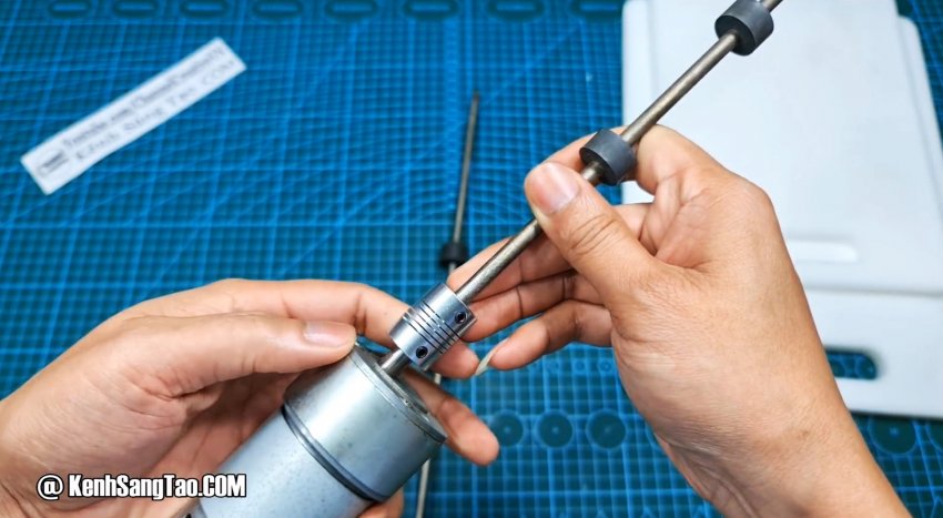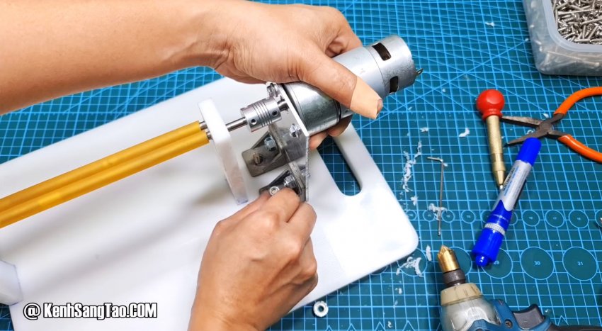 На ней же закрепляется двигатель. Для этого используется пластина из алюминия и монтажные уголки. Выступающий вал вальцов соединяется с двигателем с помощью фланца. Все крепления выполняются болтами, так как саморезы не выдержат нагрузки.