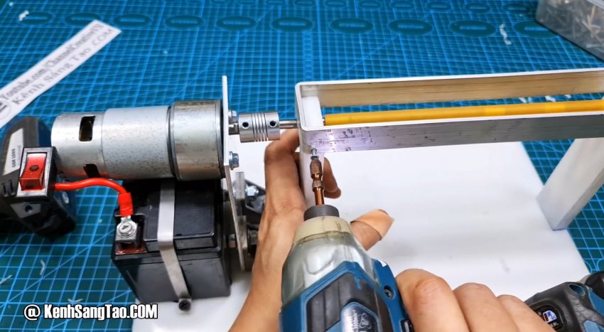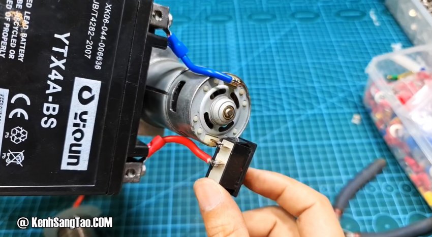 Под двигатель с помощью скобы из полосы металла прикручивается аккумулятор. Он соединяется с мотором проводами через выключатель.