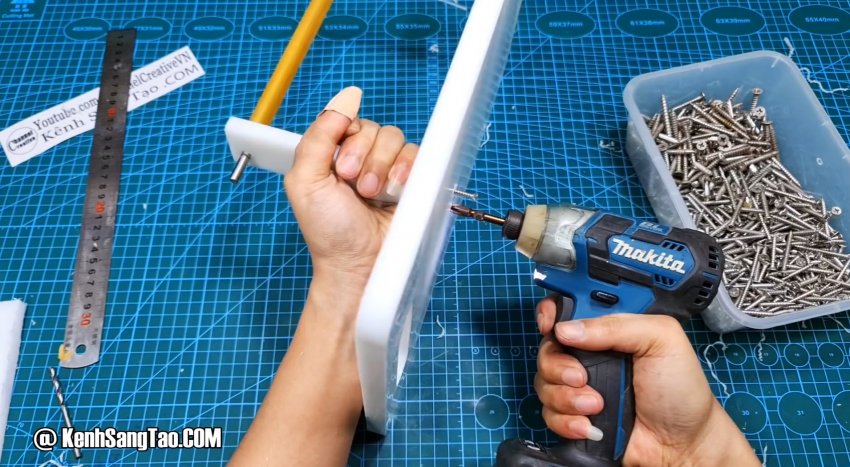 Стойки с валами прикручиваются ко второй цельной разделочной доски на саморезы.