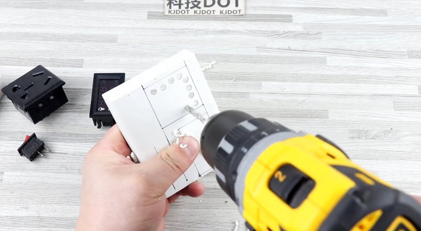 В крышки распаечной коробки вырезаются окна под розетку, вольтметр амперметр и выключатель.