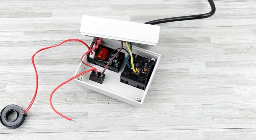 Вторая жила питания подводится к выключателю. Уже от него прокладывается перемычка ко второму контакту розетки через кольцевой трансформатор. К ней нужно будет подпаять второй провод от амперметра вольтметра.