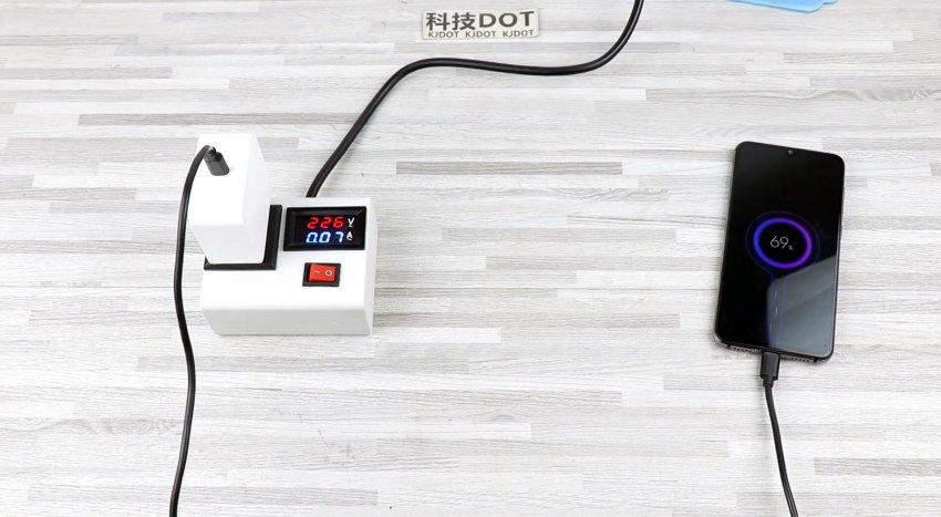 Такое устройство можно сделать с длинным проводом и использовать еще и как удлинитель. Определить мощность потребления включенных приборов, можно просто умножив выдаваемые значения на дисплее устройства, то есть амперы на вольты. К примеру, при подключении зарядки телефона прибор показывает 226 В и 0,07 А. После умножения получаем уровень потребления смартфона в 15,82 Вт.