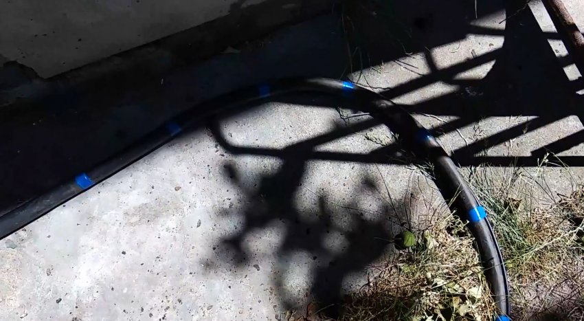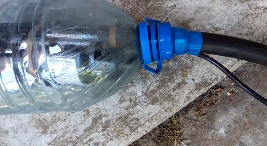 Сквозь нее, к нему подводится садовый шланг и затягивается хомутиком. Далее нужно обмотать его изолентой так, чтобы загерметизировать отверстие.