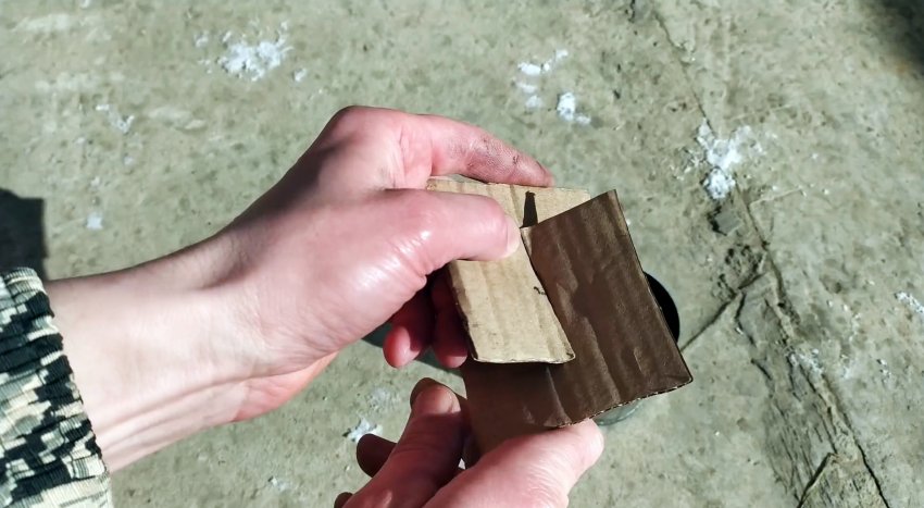 Чем она вместительней, тем дольше будет горение без дозаправки. В банку вырезается фитиль из гофрокартона. Для этого 2 картонных прямоугольника нужно разрезать вдоль наполовину.