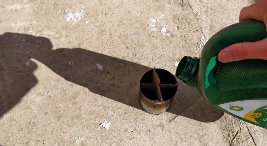 С одной стороны на ней нужно сделать надрезы, чтобы загнуть часть металла внутрь. Тот послужит дном для установки банки.
