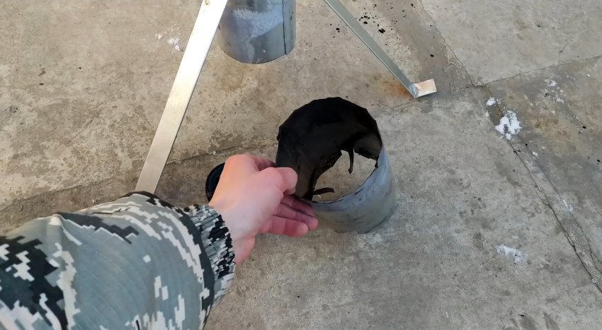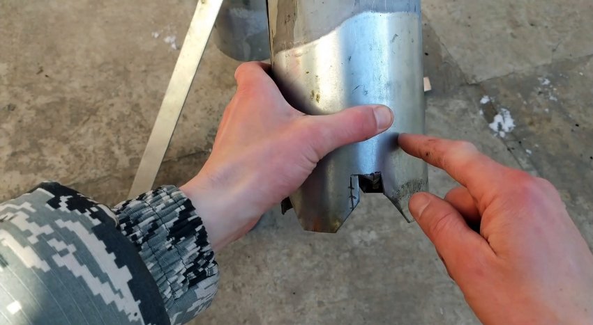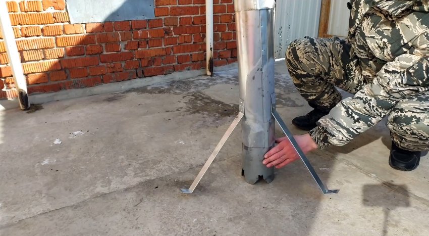 Верхняя ступень печки представляет собой более длинный кусок водосточной трубы, который надевается раструбом на низ. Вверху вторая ступень стыкуется с тонкой трубкой дымоходом. Последнюю нужно будет вывести за пределы палатки или теплицы. Для устойчивости ко второй ступени на заклепки устанавливаются 3 ножки из полосы жести.