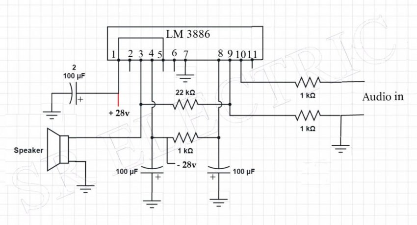 Тип усилителя - АВ. Питание - двуполярное. Для включения данной микросхемы существует много различных схем. Мы же будем использовать самую простую с минимальным количеством деталей.