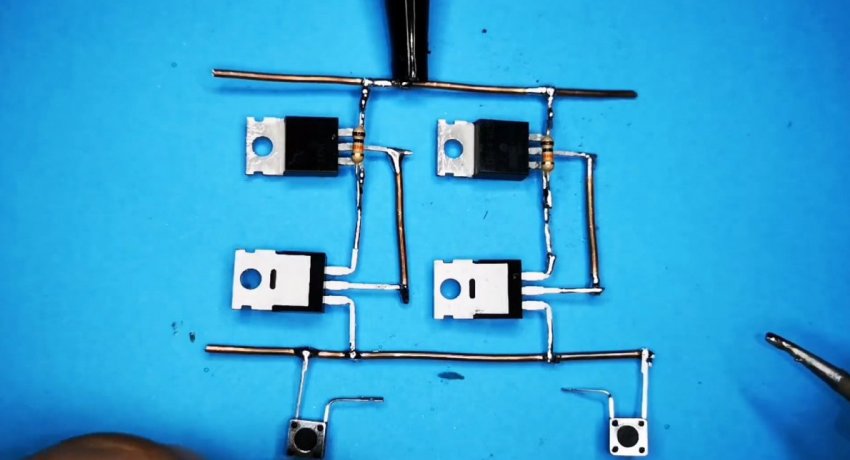 Как видно из схемы, используются транзисторы разной проводимости, которые включены между собой в единый мост. Визуально схему можно разделить на левую и правую стороны, которые по строению своему идентичны друг другу.