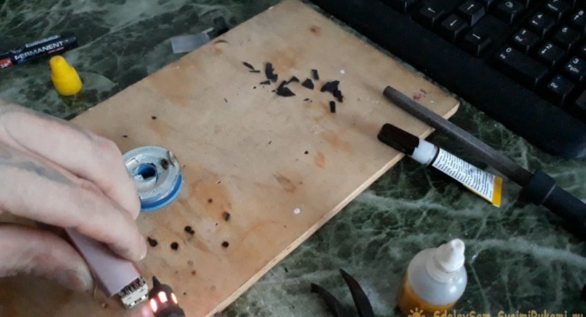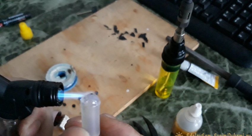 После этого нужно заизолировать контакты. Нагревать ради такого пустяка клеевой пистолет, я пожалел времени, и просто разогрел клей зажигалкой, и мазнул им по контактам.