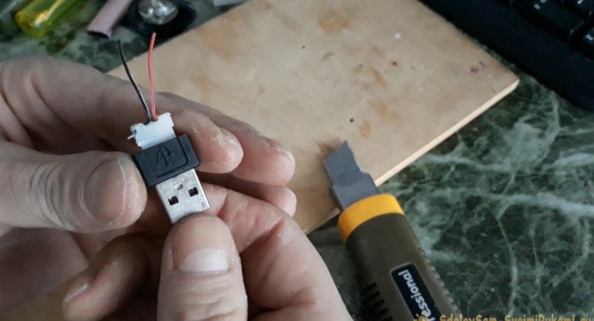 Дело на 15-20 минут! Для начала возьмём штекер от старого или сломанного USB провода. С помощью канцелярского ножа и плоскогубцев, снимем с него оплётку. Но не полностью, а оставим примерно миллиметров десять в середине. Вот так:
