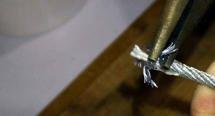 Если не помог первый метод, перейдем ко второму. В строительном или хозяйственном магазине купите 2-3 метра тонкого троса. Это не дефицит, стоит немного. Возьмите плоскогубцы, распушите край троса и загните проволочки вверх.