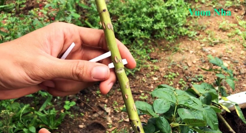 В расщелину вставляется 2 короткие отрезка коктейльной трубочки. Если ветка длинная, то на ней можно сделать несколько таких насечек с шагом 30-40 см.