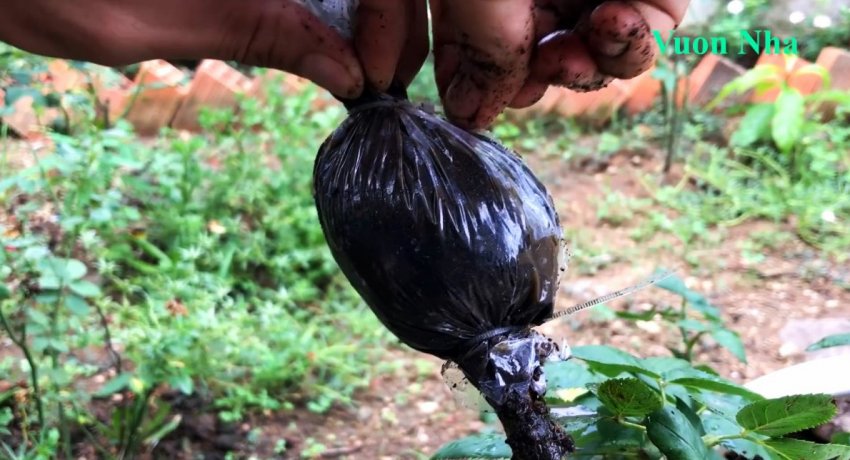Ветка обрезается ниже комка. Затем пакет удаляется, и саженец готов к посадке в открытый грунт.