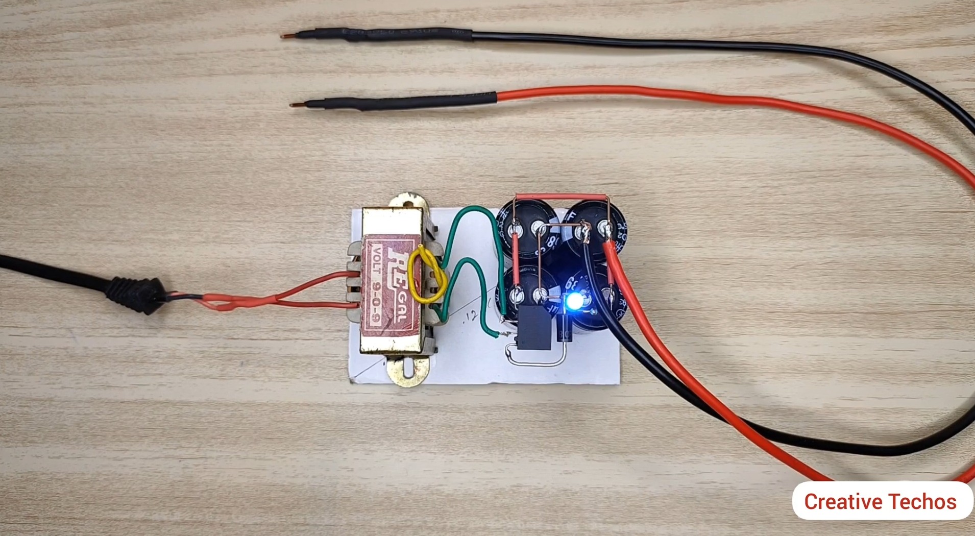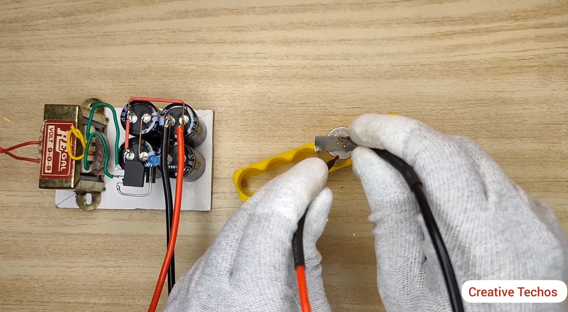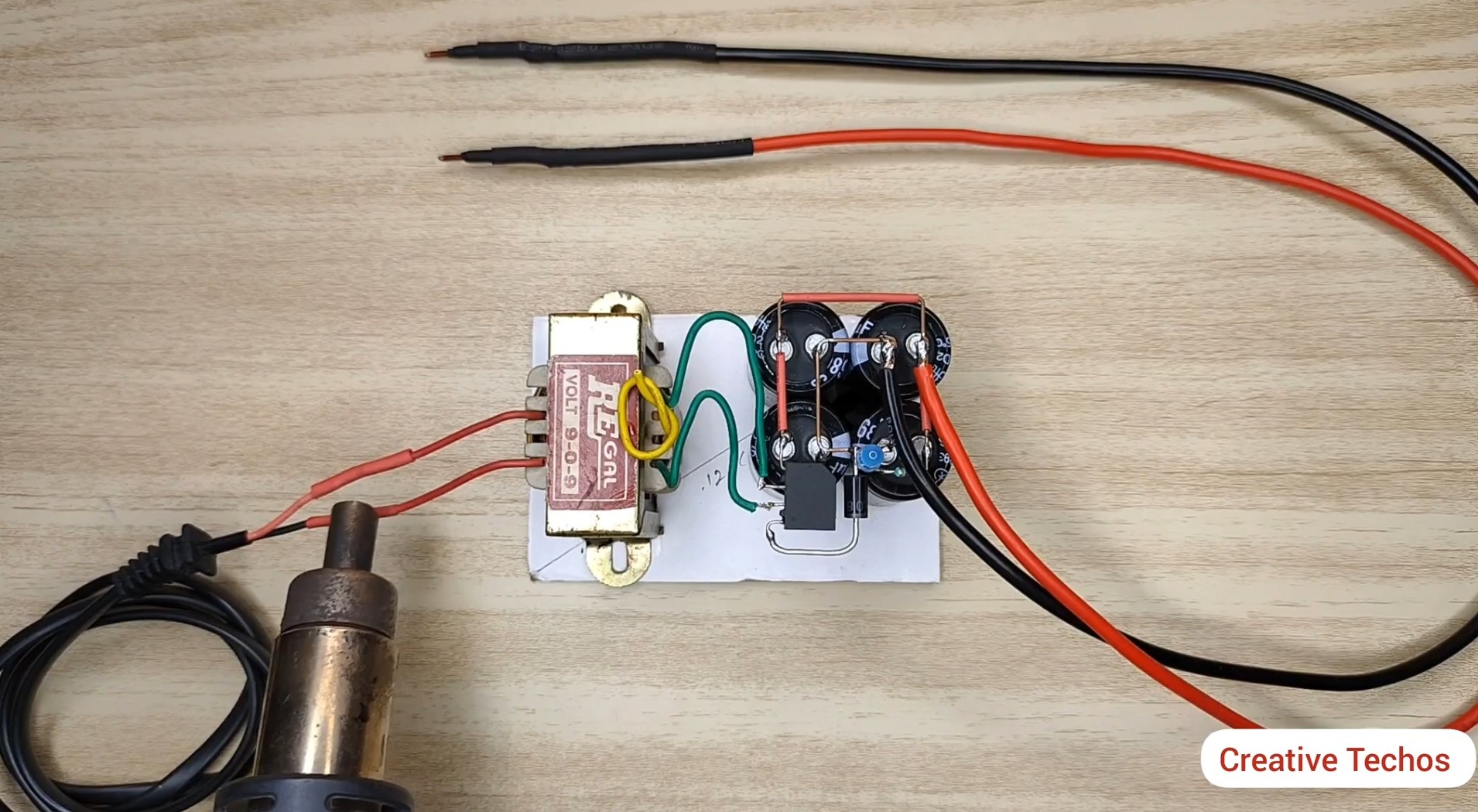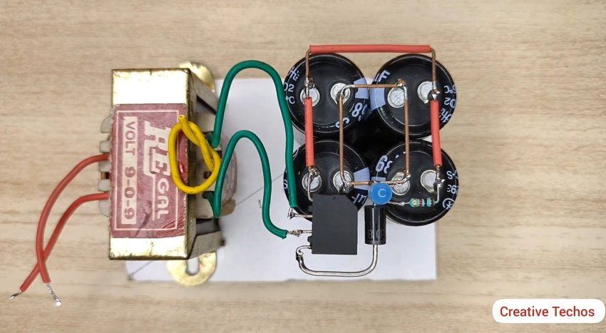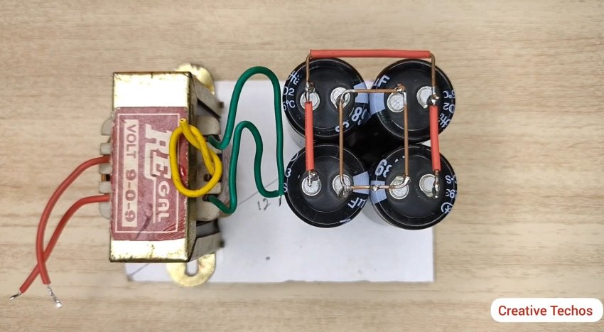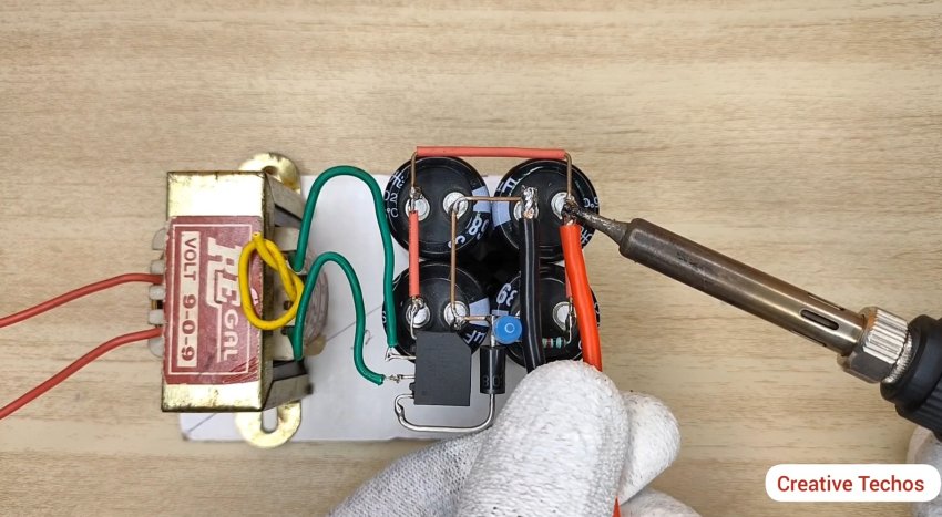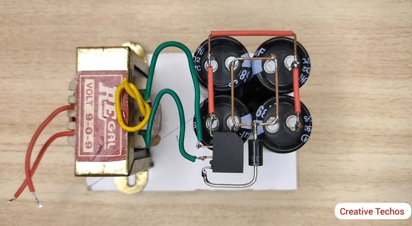 Припаиваем вторичную обмотку от трансформатора к диодному мосту и к конденсаторам согласно схемы.