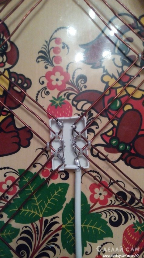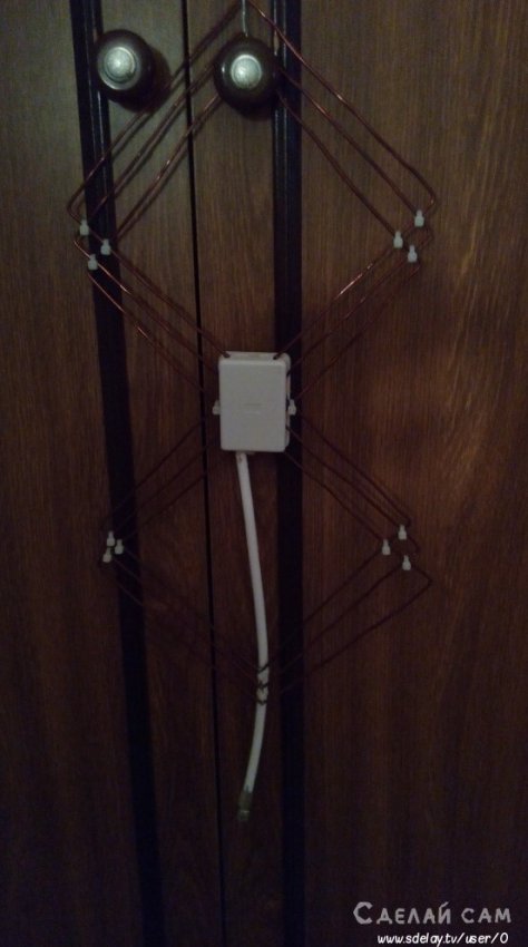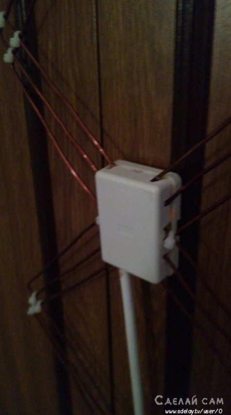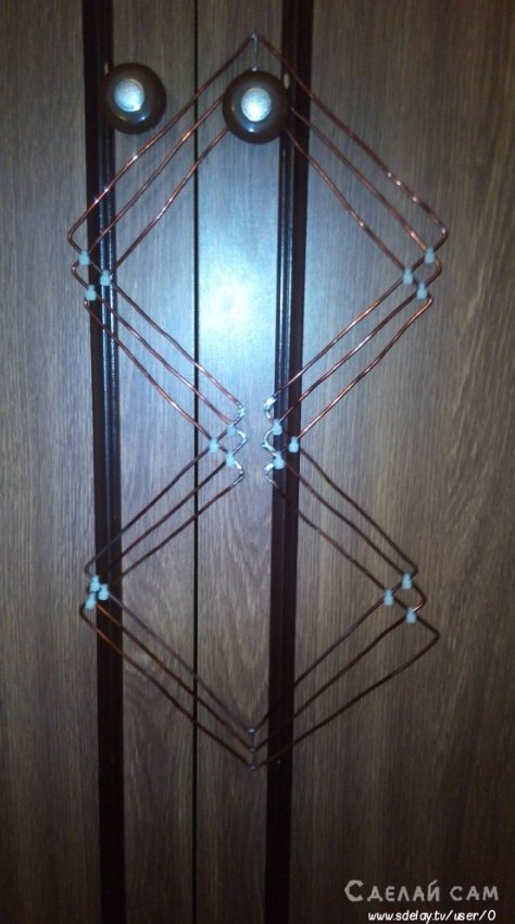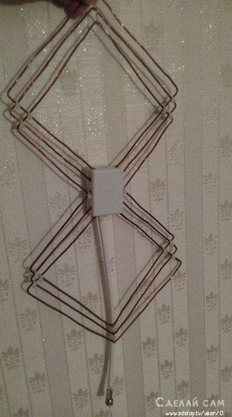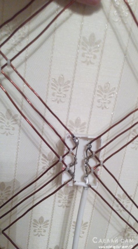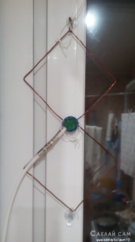Возьмите 110 см толстой медной проволоки и согните под 90 градусов (верхние и нижние по 14 см, а внутренние стороны по 13 см.) Место соединения кабеля должно = 2см. Вешайте антенну на ручку оконной рамы или на присосках в середине рамы или к стеклу. Замеры взял на сайте: