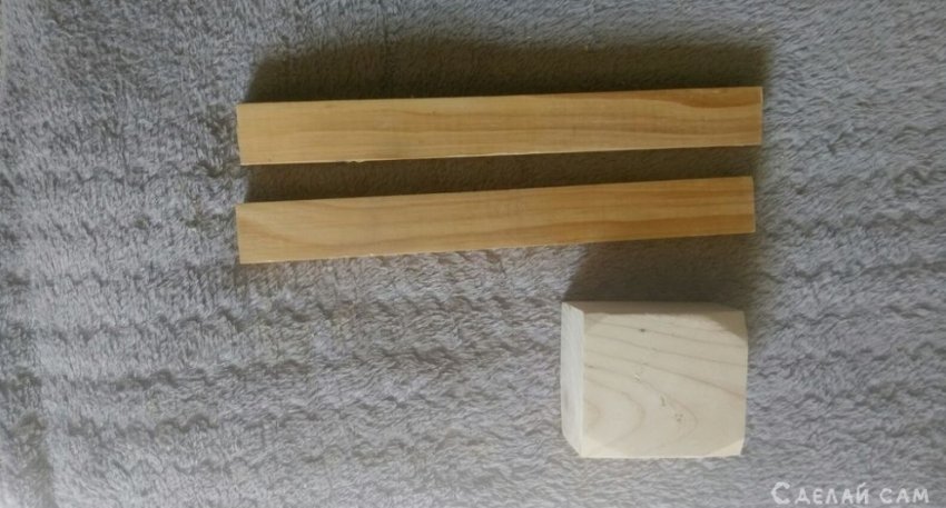 Для начала, отрезаем два ровных куска рейки. Шлифуем их наждачной бумагой.