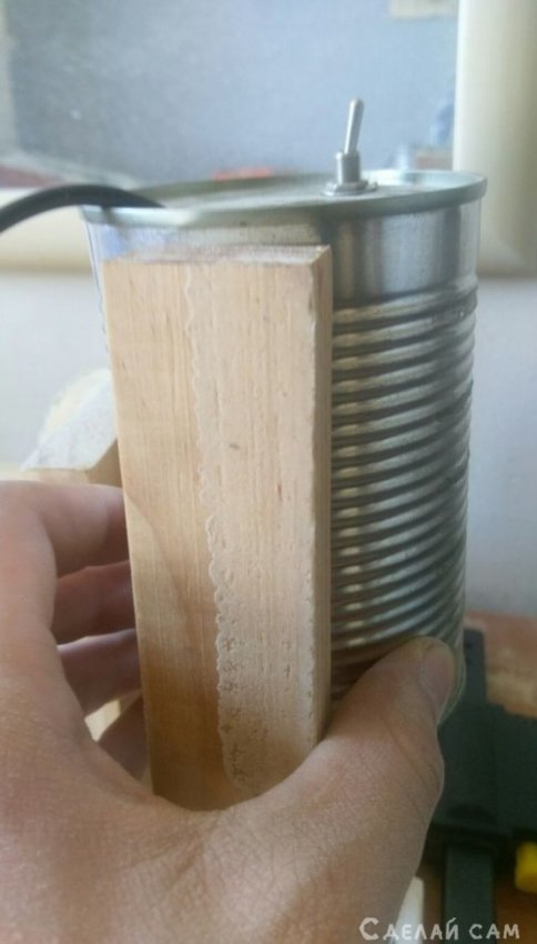 После этого, отрезаем небольшой брусок, по ширине жестяной банки. Шлифуем его.