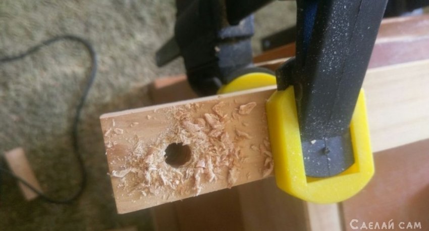 По ширине винта высверливаем дрелью отверстие, через две рейки и банку. Важно, при этом не помять банку.