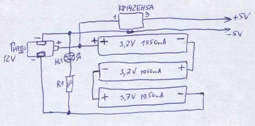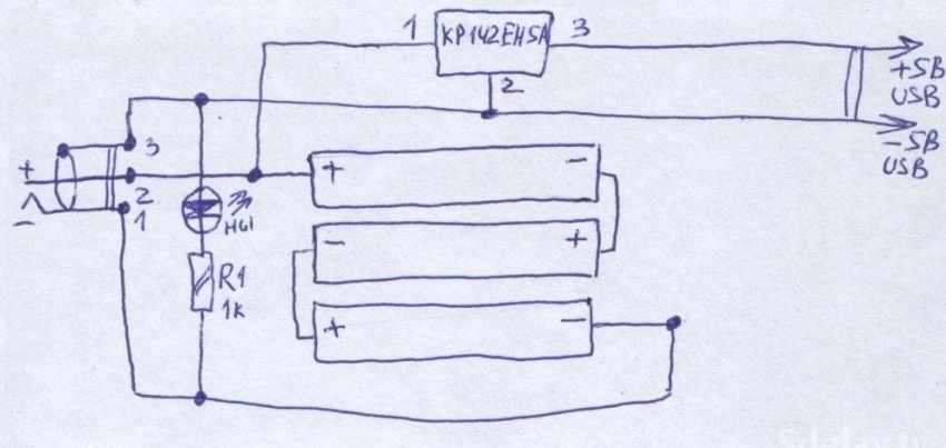 Схема простая. Я использовал три аккумулятора по 3,5 вольта и 1800мА. Такие аккумуляторы можно взять из старых ноутбуков. Один стабилизатор КР142ЕН5А (выглядет как транзистор) он понижает напряжение от 15 вольт до 5 вольт, один светодиод зеленый и один резистор от 1 кОм до 3 кОм. Два гнезда, одно для питания 12 вольт и выходное гнездо USB для телефона.