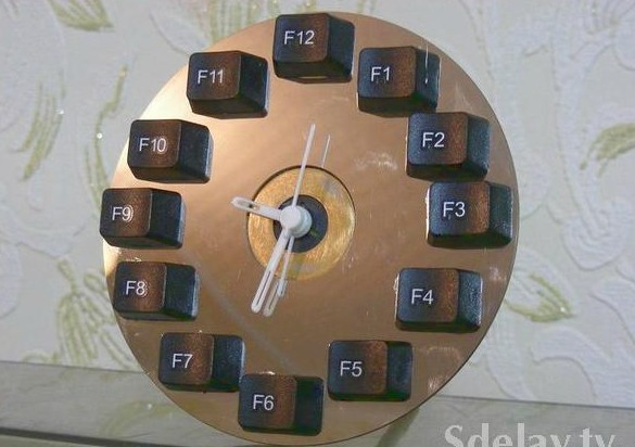 Всем привет! Сегодня я хотел бы вам рассказать, как можно сделать вот такие часики своими руками. Я их назвал часики компьютерщика потому, что в материалы для их изготовления входят обычный CD или DVD диск и клавиши от компьютерной клавиатуры. И так, чтобы сделать такие вот часики, нам понадобится: 1. Обычные, вот такие часики, которые можно купить на рынке, за не большую сумму денег. Думаю, что почти у всех дома наверное есть такие часики. 2. Обычный CD или DVD диск. 3. Клавиши от обычной компьютерной клавиатуры. Нам нужны такие клавиши как: F1, F2, F3, F4, F5, F6, F7, F8, F9, F10, F11, F12. 4. И вот такой универсальный секундный клей 505. И так. Приступим к изготовлению наших часиков. Берём часики, розбираем их аккуратненько, снимаем стрелочки, ложим их пока всторонку, и оставляем только вот в такую коробочку: В ней и есть сам механизм наших часов. Теперь берём клавиатуру, разбираем её, легонько вынемаем клавиши, которые нам нужны для наших часиков. Теперь берём диск и при помощи клея приклеиваем на него наши клавиши. Приклеиваем таким образом, чтобы у нас получился циферблат как на часиках. И оставим на некоторое время, чтобы наши клавиши хорошо приклеелись к диску. После того как всё высохнет, берём наш диск с уже приклеенными клавишами и приклееваем его на нашу коробочку с механизмом так, чтобы ось на которой держатся стрелочки часиков, находилась ровно посредине диска. И снова же оставляем это на некоторое время, что бы клей высох и наш диск хорошо приклеелся. После того как клей высох, берём стрелочки и крепим их обратно на ось, переворачиваем наши часики, вставляем батарейку, наводим точное время, и вот у нас получились такие вот часики. А если же у вас диск с каким-то красивым изображением на обложке, то можите купить такие маленькие пластмасовые циферки, так же наклеить их на диск и у вас получатся отличные часики, которые могут отлично вписаться в интерер вашего дома. Ну чтож. Всем пока. Надеюсь Вам понравилась эта идейка. Если возникли вопросы, пишите на мой ящик: tolik.kharzhevskiy@mail.ru Или на мою страничку ВКонтакте: https://vk.com/bleck_wolf2015