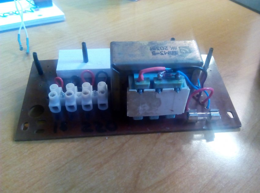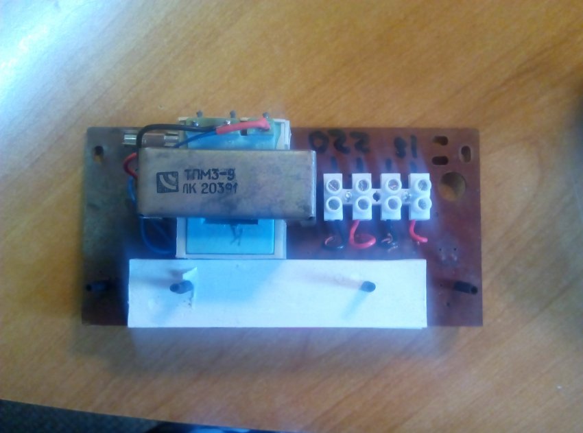 В нижню часть АКБ (теперь фасад часов) ввинтил 4 болта с ограничительными стойками для крепления платы часов, предварительно проделав отверстие для циферблата и кнопок (расчитывал на тетрадной клетке). Затем на другую плату установил штатный транс, клеммную колодку и предохранитель (враги-трусы насоветовали), и с прикреплёнными опорами установил на дно на стойки (не прикручивал - ну его в баню).