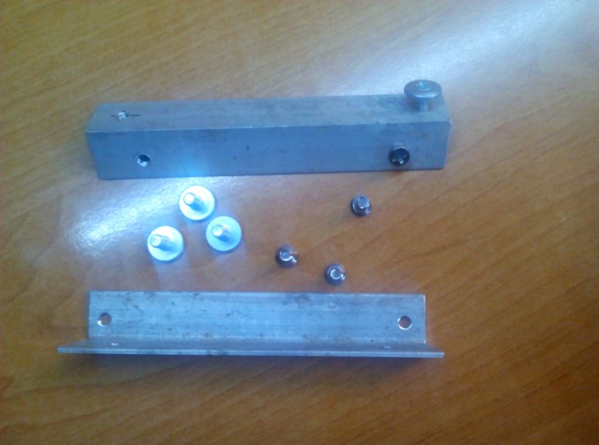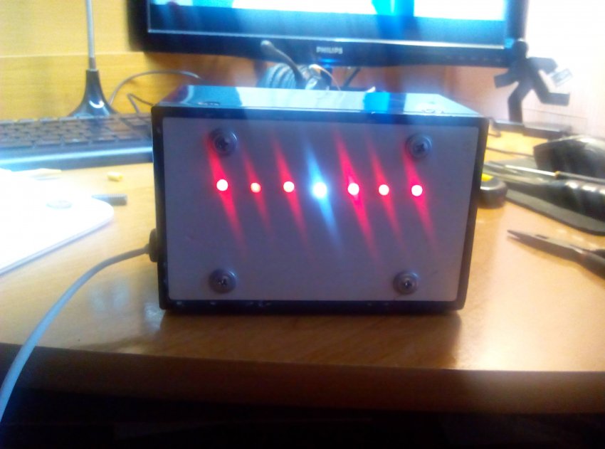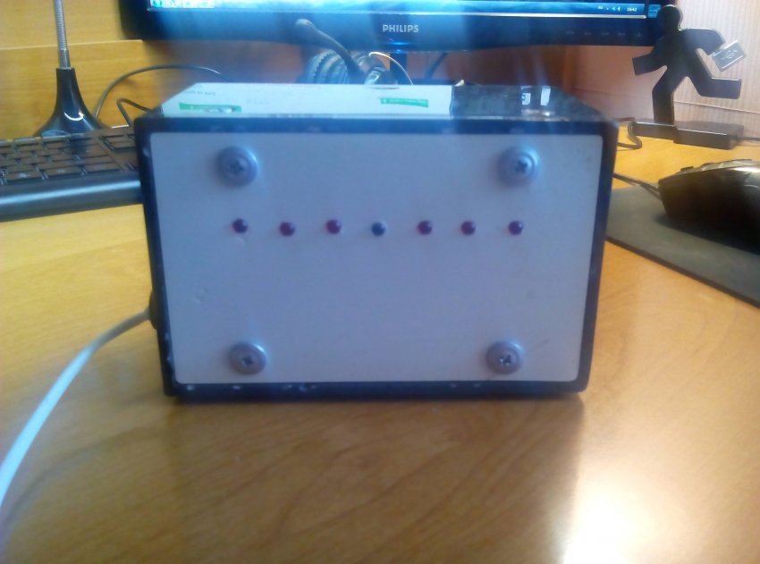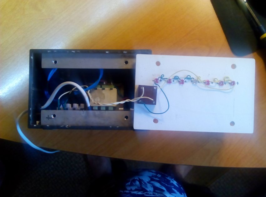 Тыльную сторону сделал из легкообрабатываемого пластика с рекламного щитка в 2 слоя. 2 алюминиевых уголка засверлил, зарезьбил, прикрутил к корпусу, а потом уже и крышку уложил и прикрутил. Ах, да! В крышке пробил 7 отверстий под светодиоды для тыльной (нафига?) подсветки - шесть слабых красных и яркий белый центр, приклеил диодный мост, пустил это всё через 2 резюка (номинал не помню - чтоб не погорели диоды). Крышку на болты.