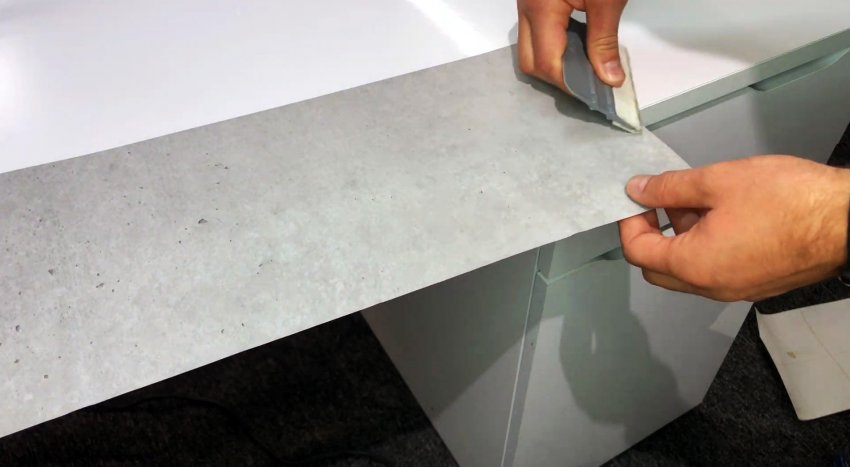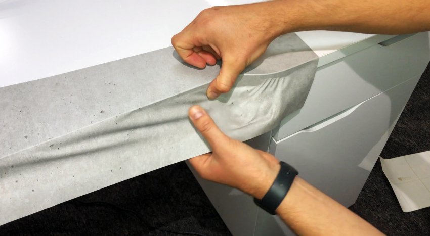 Если мебель имеет скругленные края, то лист пленки вырезается с хорошим запасом на свесы 6-10 см. Сначала протираем поверхность от пыли, обезжириваем, и клеем пленку на лицевую сторону как обычно.
