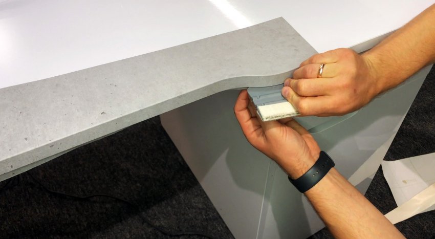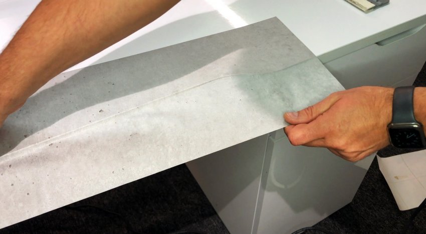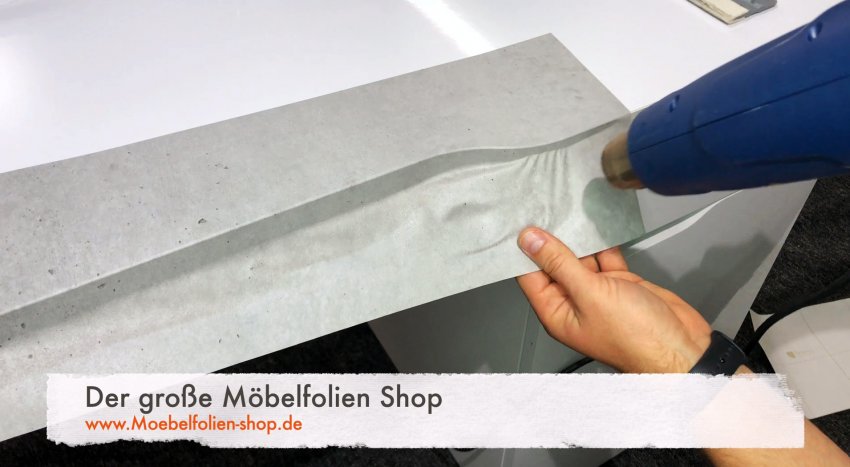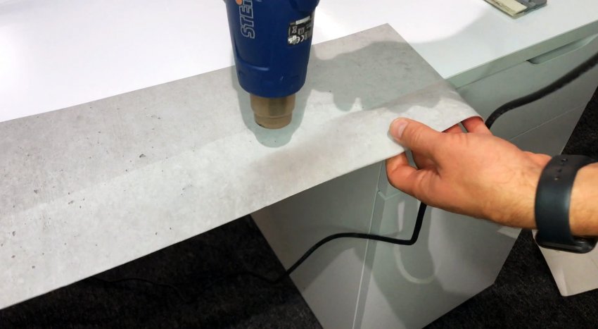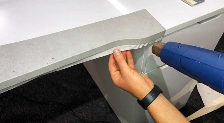 Теперь греем плену на изгибе, и разгоняем тепло от нее до краев. Затем тянем напротив изгиба, и приклеиваем ее на кромку, равномерно разглаживая пальцем.