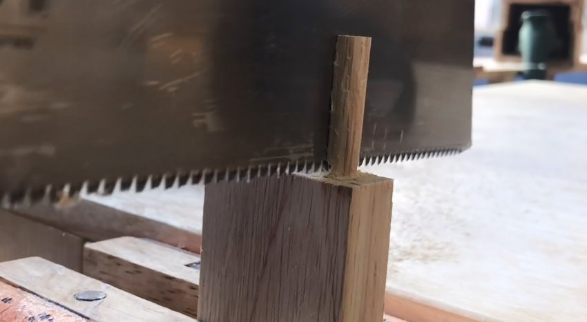 Паз после сверла дорабатывается стамеской. Затем изготавливается шип на ширину входного отверстия в паз. Он делается ровным, как и обычно. Его можно выпилить циркуляркой, ножовкой, или же ими вместе. С боков он скругляется стамеской.