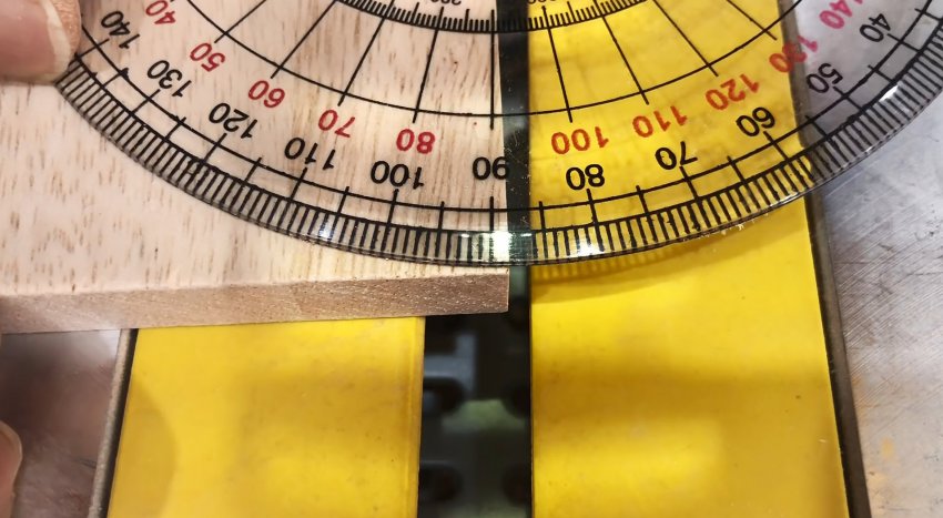Для этого нужно подложить что-то под заготовку, и выровнять ее по транспортиру под данный угол.