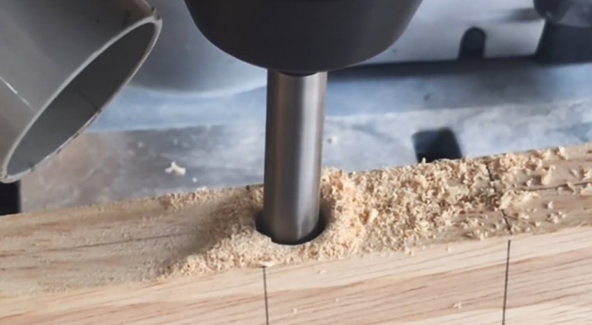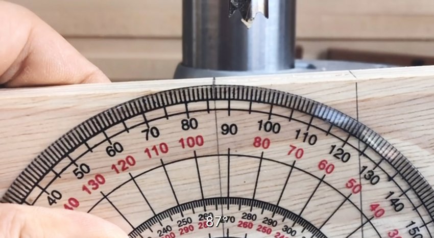 Однако паз делается не фрезером, а сверлильным станком. Он размечается, после чего слева засверливается сверлом, наклоненным под 87 градусов.