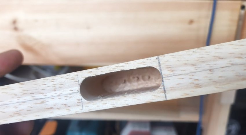 С другой стороны, край паза просверливается уже под углом 93 градусов. Затем между отверстиями он выбирается уже направленным сверлом под прямым углом.