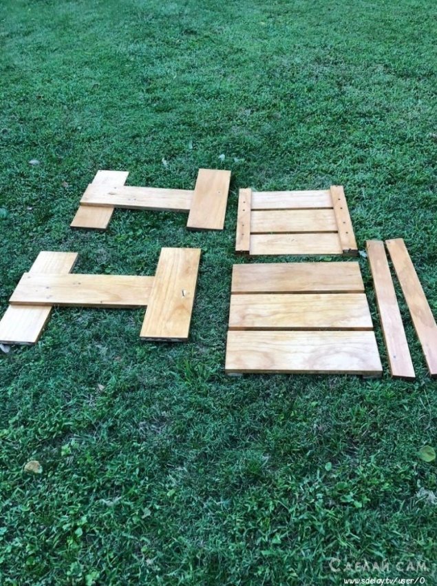 Сидушку крепим к двум осях. Перекладины ставим в местах расположения рук. Своего рода подлокотники. Спинка у нас размещается под углом. Крепим все на обычные саморезы по дереву.