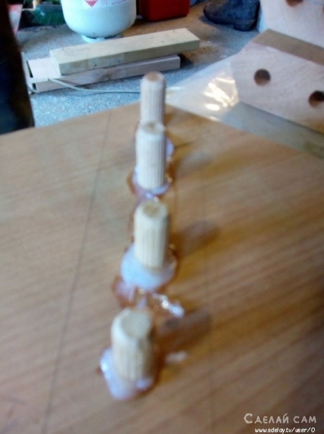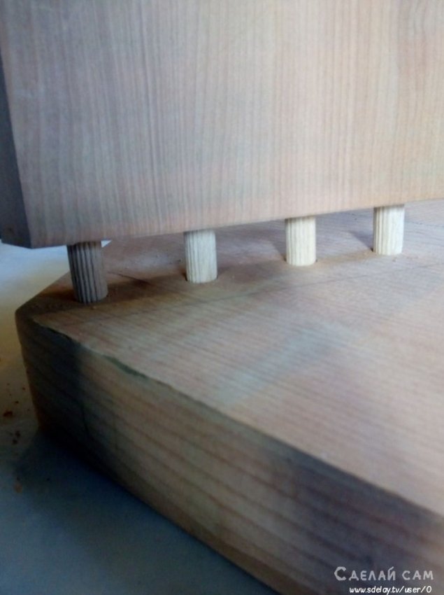 Ножки крепим на так называемые "деревянные гвозди". Круглые колышки. Продаются в большинстве магазинов строительной направленности.