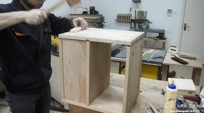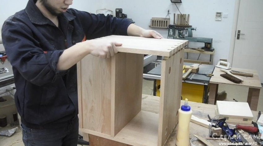 Начинаем сборку тумбочки. При такой конструкции достаточно просто сделать какую-то ошибку, в результате чего конструкция получится кривой. Поэтому нужно все тщательно проверять.
