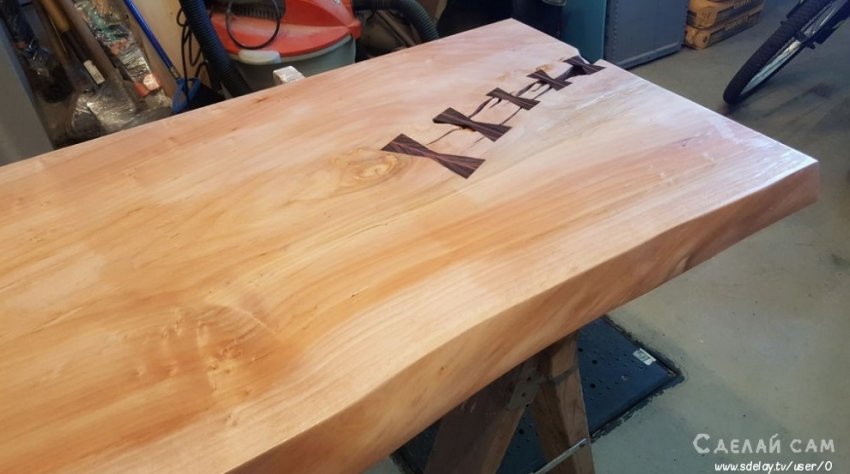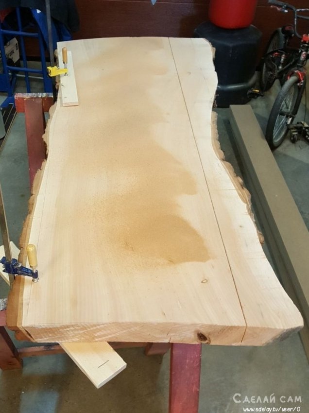 Первым делом, я заспаклевал изьяны дерева. Срезал по габаритам стола. Получился следующий прямоугольник.