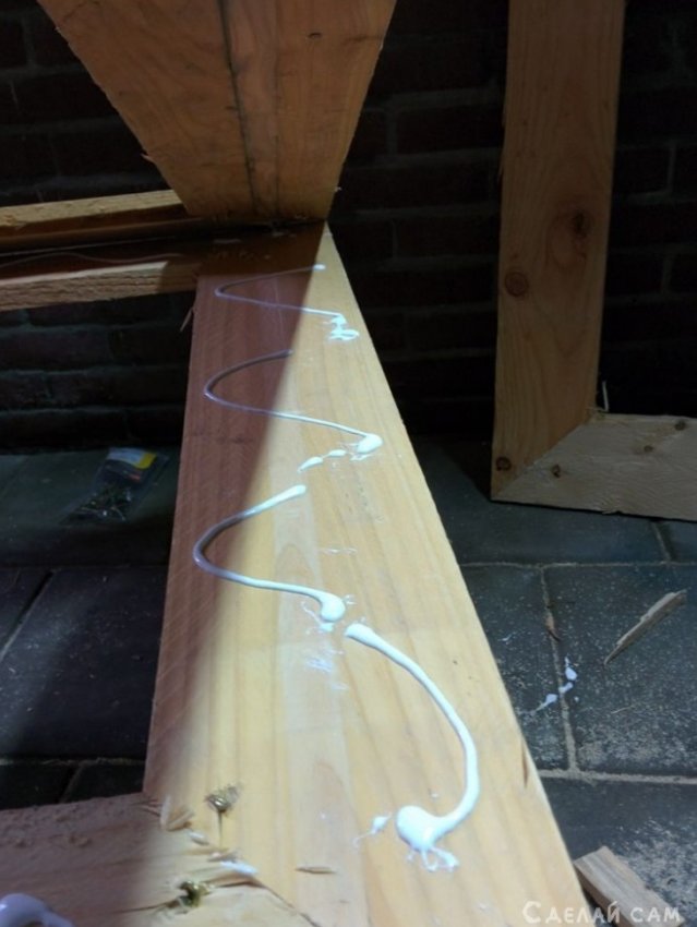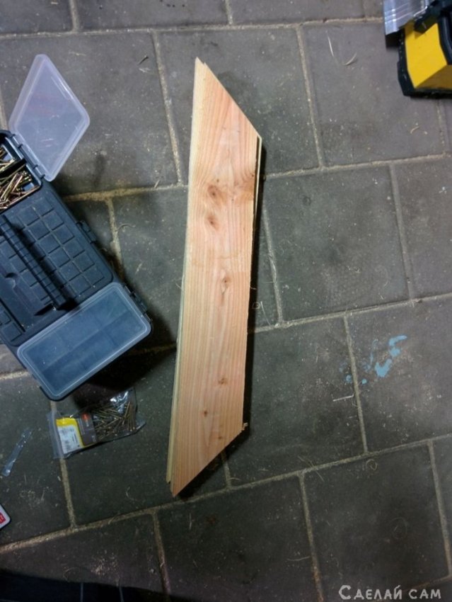 Фиксируем все с помощью саморезов. Далее шлифуем поверхности, покрываем морилкой, и лаком. Даем просохнуть.