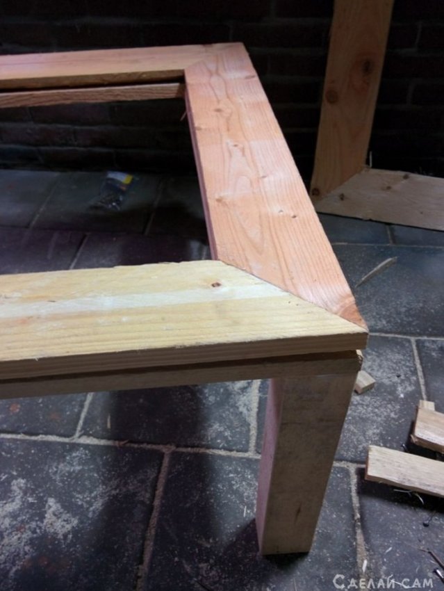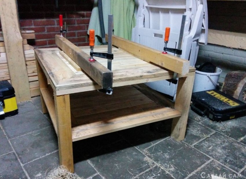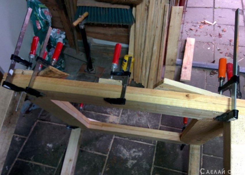 Склеиваем их между собой клеем по дереву, фиксируем струбцинами. Даем просохнуть. Далее прикручиваем ножки.