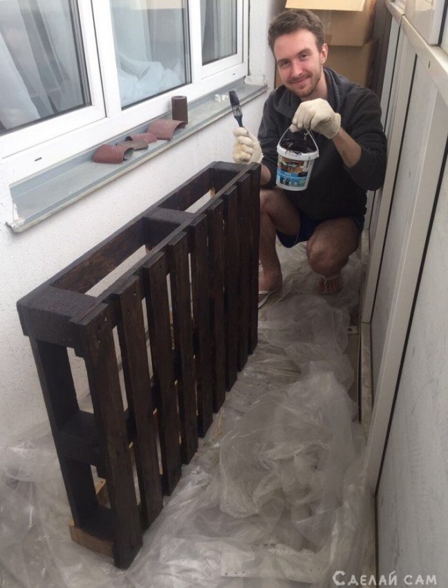 Первые четыре поддона пойдут на основу кровати. Их нужно хорошенько зачистить, шлифануть. После чего обработать спец морилкой, а также лаком.