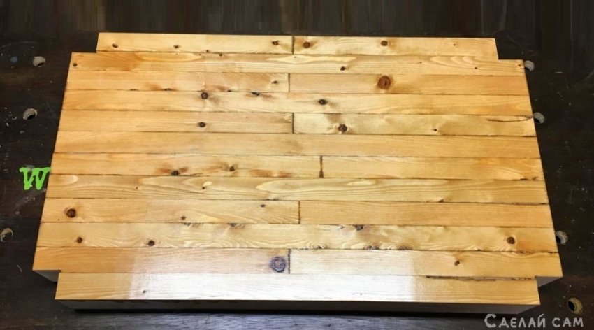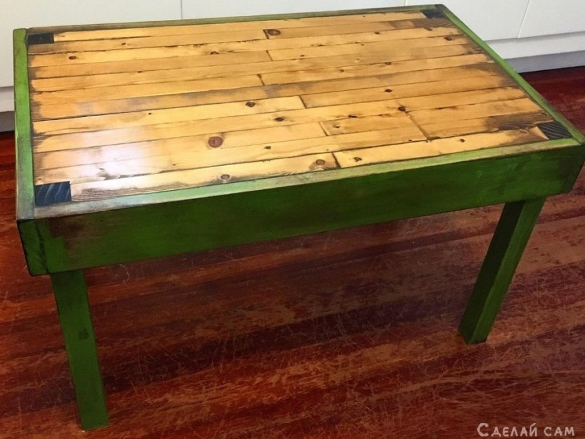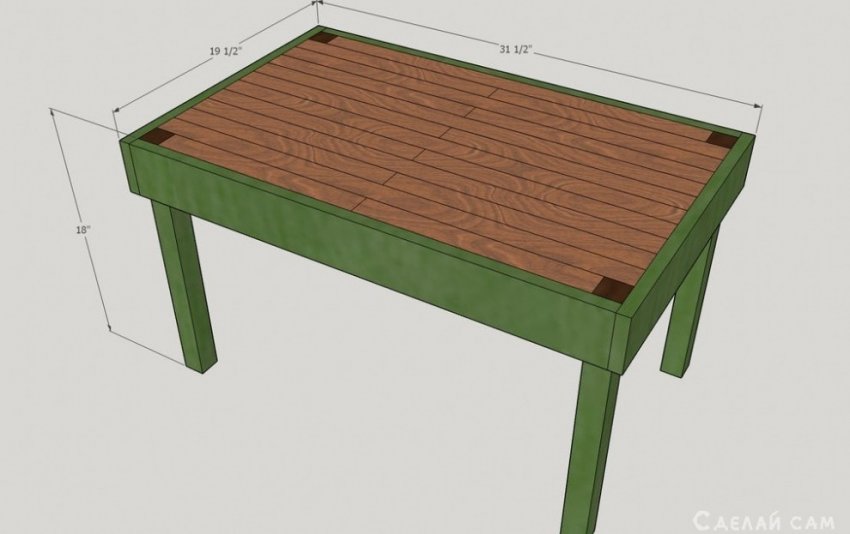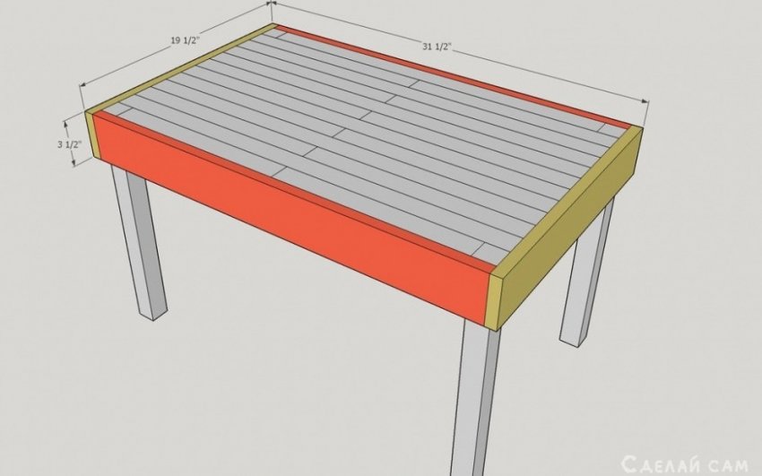 Вскрываем лаком столешницу. Весь прямоугольник обшиваем каркасом из четырех реек (предварительно окрашенным в зеленый цвет). Крепим с помощью саморезов.
