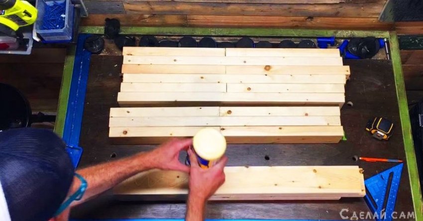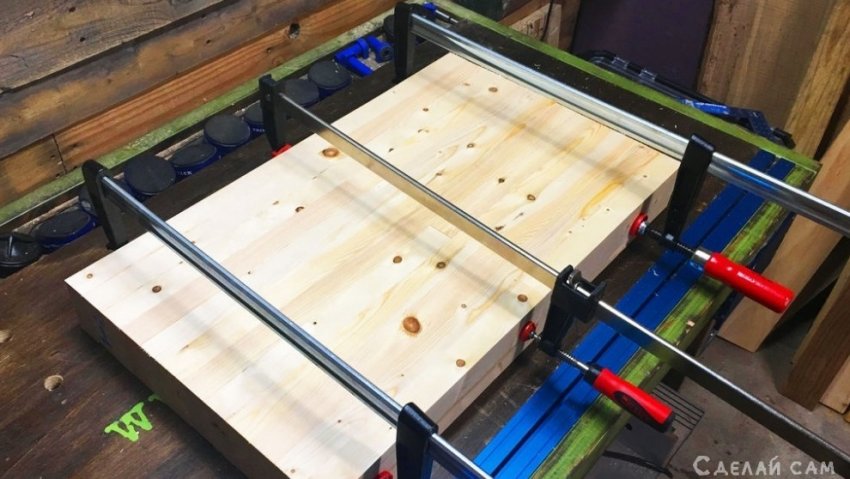 Первым делом, нужно подготовить столешницу. Для этого проклеиваем рейки, формируя плиту следующим образом. После чего, с помощью струбцины (несколько штук) фиксируем столешницу, оставляем на 24 часа, пока не просохнет.