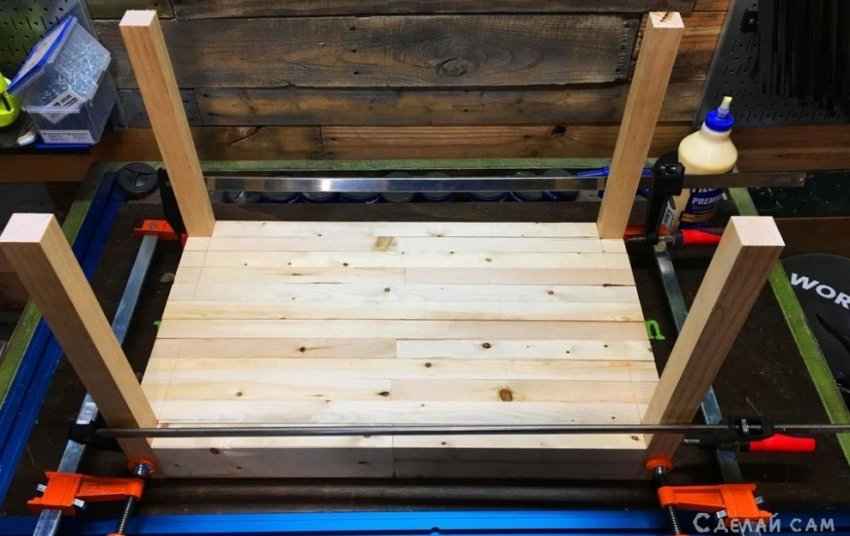Крепим ножки. Проклеиваем соединения. Зажимаем струбцинами. Даем просохнуть.