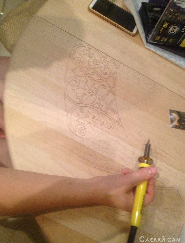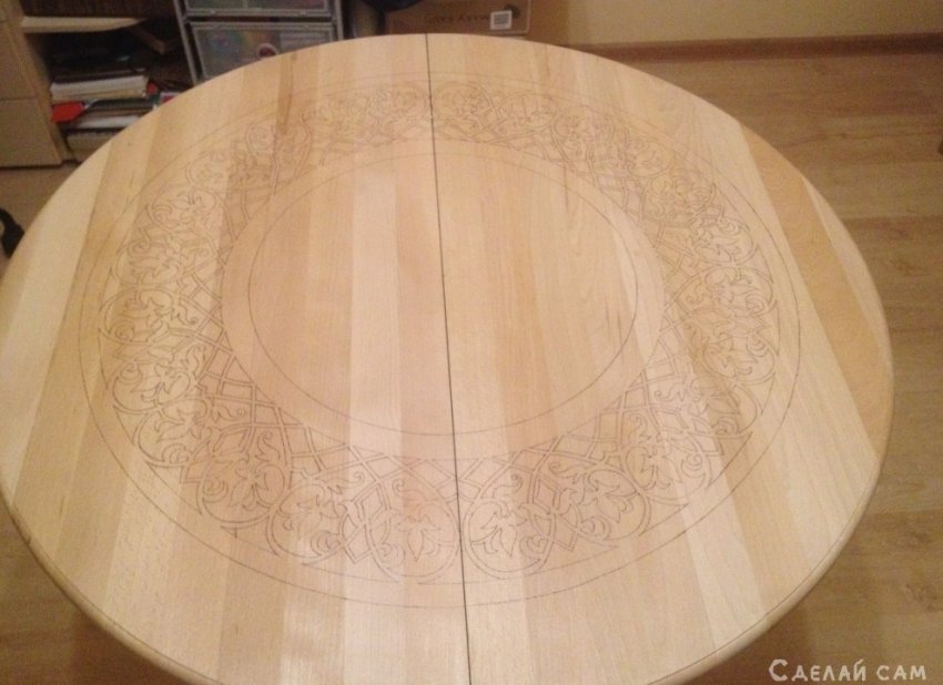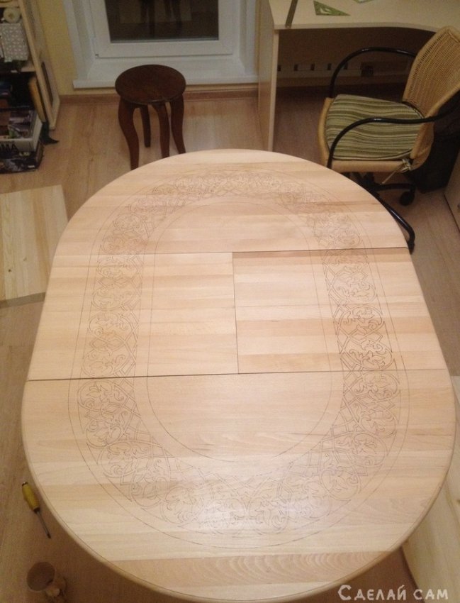 Перемычка (часть столешницы) устанавливается по средине, в пространство подготовленное для нее. Деревянные кругляши крепят часть к столу, создавая единую плиту. При необходимости можно расширять стол, и задвигать его обратно, когда такой необходимости нет. Кроме того, столешницу можно украсить, как это сделал я с помощью выжигательный.